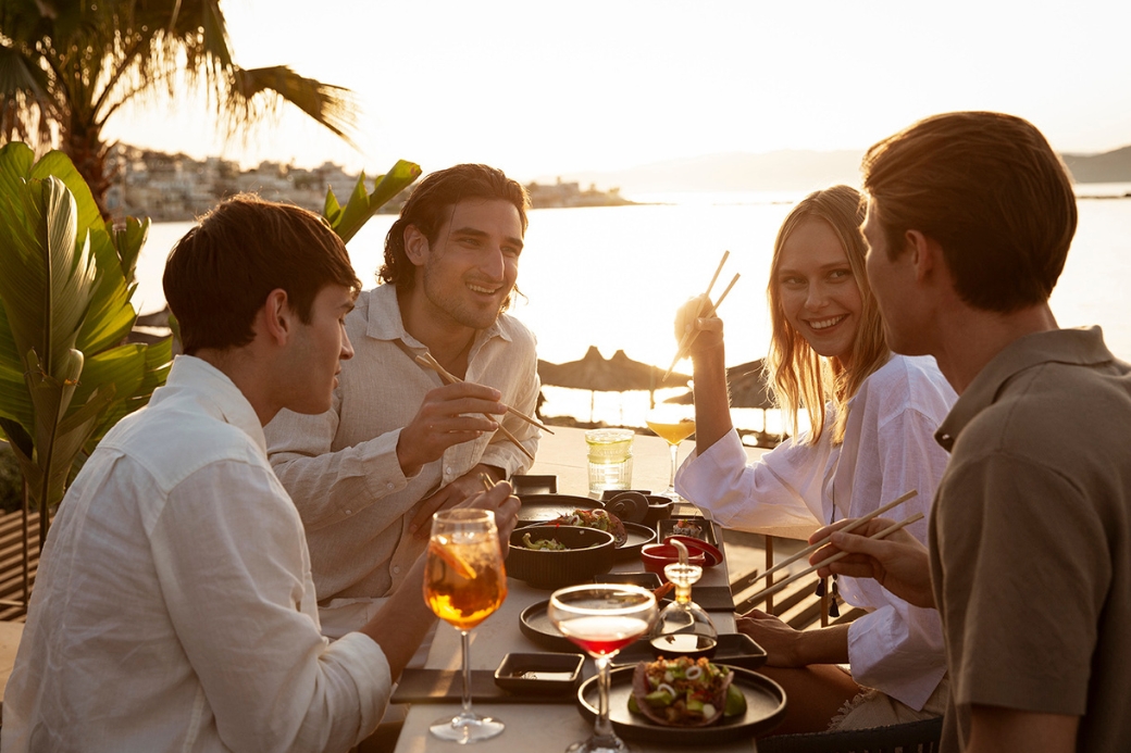 Raw Bar is an elegant all-day cocktail and champagne bar, featuring original creations by expert mixologists. Set in a magical location with breathtaking views of the Aegean Sea, it offers a vibrant atmosphere that comes alive at sunset—complete with barstools in the pool for a unique experience.